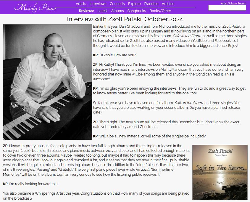 A "Safe In the Storm" Pataki Zsolt, a jelenleg Németországban élő, Magyarországon született zongoraművész/zeneszerző debütáló albuma. Dan Chadburn és Tom Nichols, két kivételes művész, ismertettek meg ezzel a kivételes művésszel, így tudtam, hogy Zsolt zenéjét nagyon megbízható forrásokból...